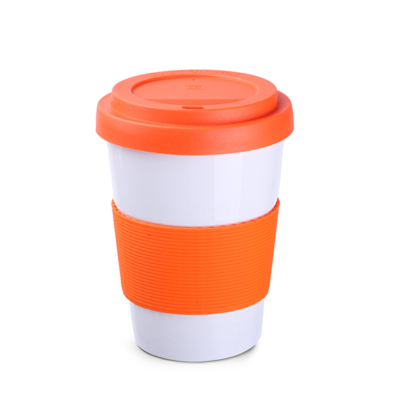 Henkelloser Porzellanbecher mit Kunststoffdeckel und 45mm-Silikonbanderole für alle Freunde von nachhaltigen Produkten. Deckel und Silikonbanderole (45 mm) in 8 Standardfarben erhältlich.